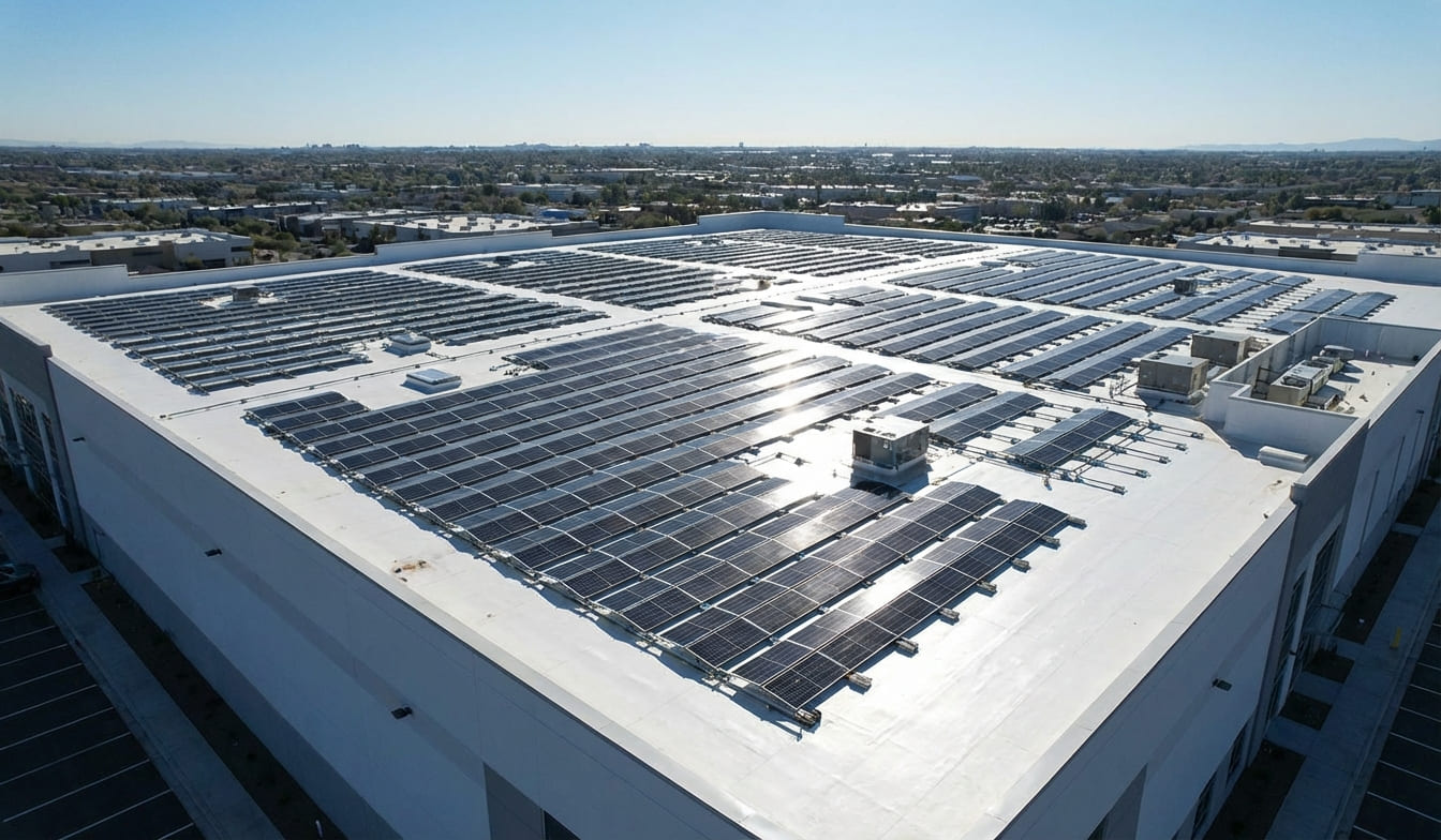 La cubierta fotovoltaica con lámina TPO permite integrar sistemas de generación solar sobre cubiertas planas, garantizando la impermeabilización y la compatibilidad con las instalaciones solares.